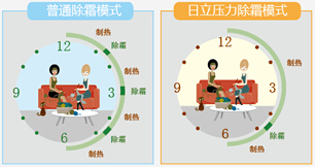 日立顶级的压力除霜模式(PTT除霜模式),以160型为例,依据室外机温度传感器、热交换器温度传感器和压力传感器,进行变参数除霜,准确把握除霜时机,单位时间内结霜量明显减少,只有普通除霜模式的1/3,降低结霜次数,确保冬季的制热效果。